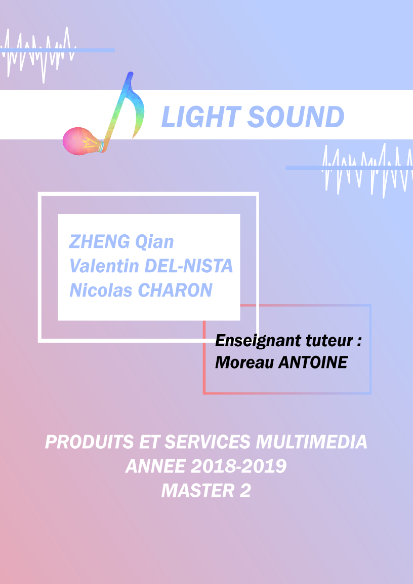Light Sound est un service proposant d’harmoniser les couleurs en fonction de la musique jouée. La couleur diffusée par la lumière sera choisie par un algorithme qui choisira quelle fréquence sonore correspond à quelle fréquence colorimétrique. De ce fait, la couleur restera toujours en harmonie avec le son. L'objectif est de modifier la couleur des ampoules en fonction de la musique jouée et du thème choisi par l’utilisateur et proposer une nouvelle manière d’écouter la musique.